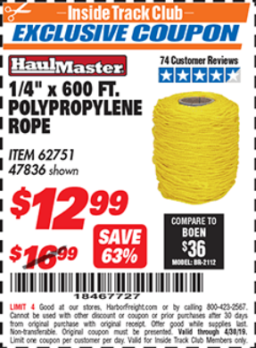 HAUL-MASTER 1/4 in. x 50 ft. Polypropylene Rope for $1.49 ... HAUL-MASTER 1/4 in. x 50 ft. Polypropylene Rope for $1.49 Inside Track Club members can buy the HAUL-MASTER 1/4 in. x 50 ft. Polypropylene Rope (Item 90760) for $1.49, valid through May 26, 2022. See the coupon for details. Compare our price of $1.49 to EVERBILT at $6.48 (model number: 64001). Save 77% by shopping at Harbor Freight.
